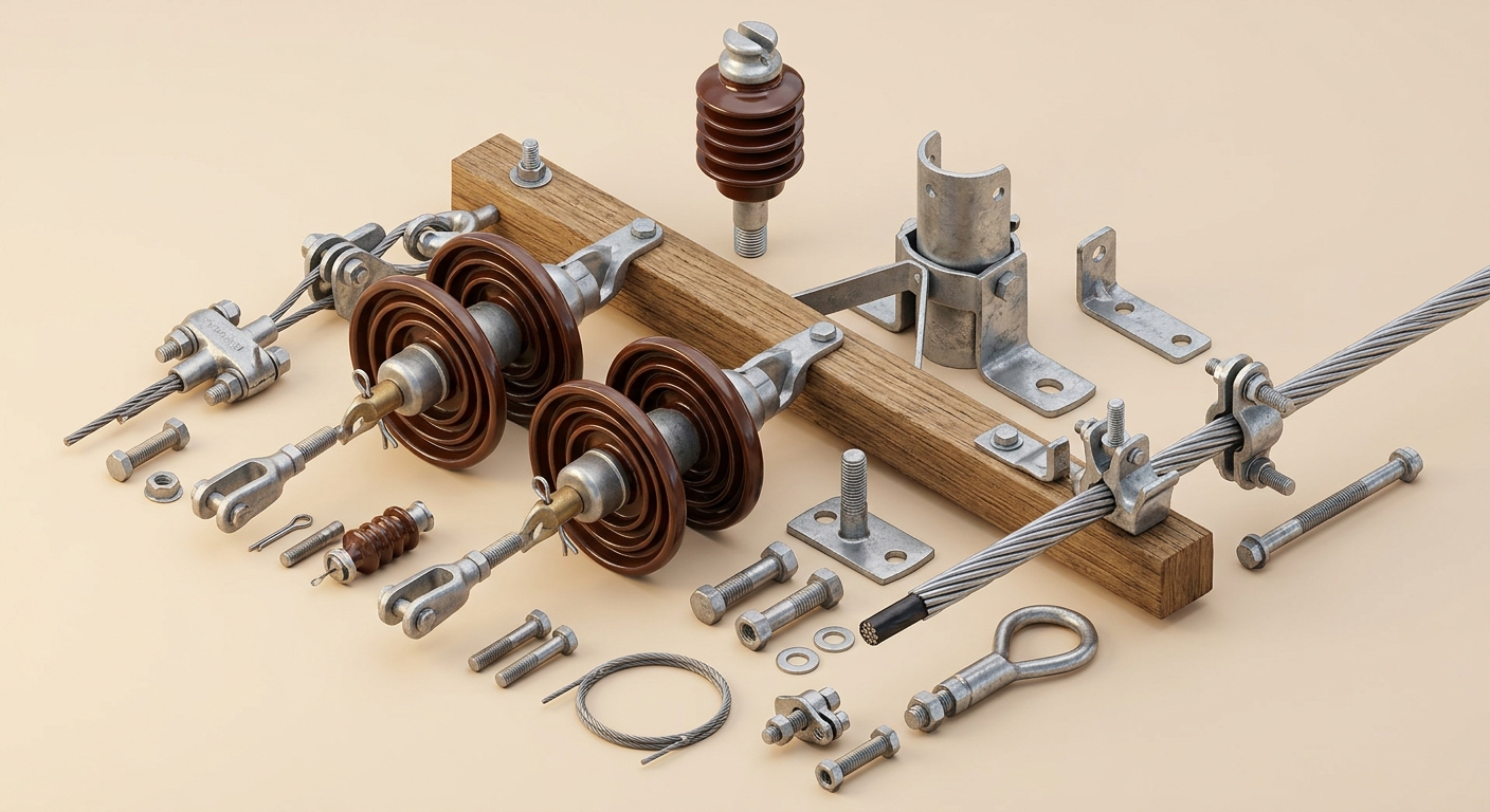 LT line hardware including pins, insulators, and fittings